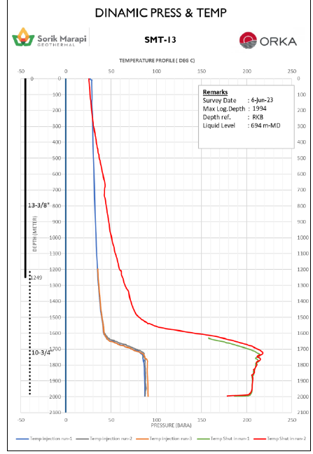 On June 7, 2023, the SMGP drilling and resource team conducted completion testing on the T-13 well, which took 27 days and was completed on June 6. Test data shows that T-13 is a high-temperature and highly mobile production well, successfully drilling out the heat source lost due to the failure of T-11 well repair. The water absorption index of the well is between 54.76kg/s/bar and 94.12kg/s/bar. After stopping water injection for 4.5 hours, the highest temperature recorded underground was 217.9 ℃. With its production layer stable at 300 ℃, the well is expected to produce 190 tons/hour of high-pressure steam.